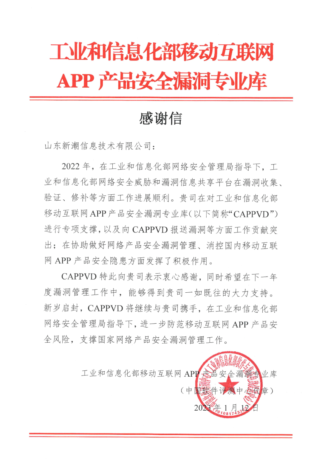 新潮信息收獲CAPPVD漏洞庫感謝信