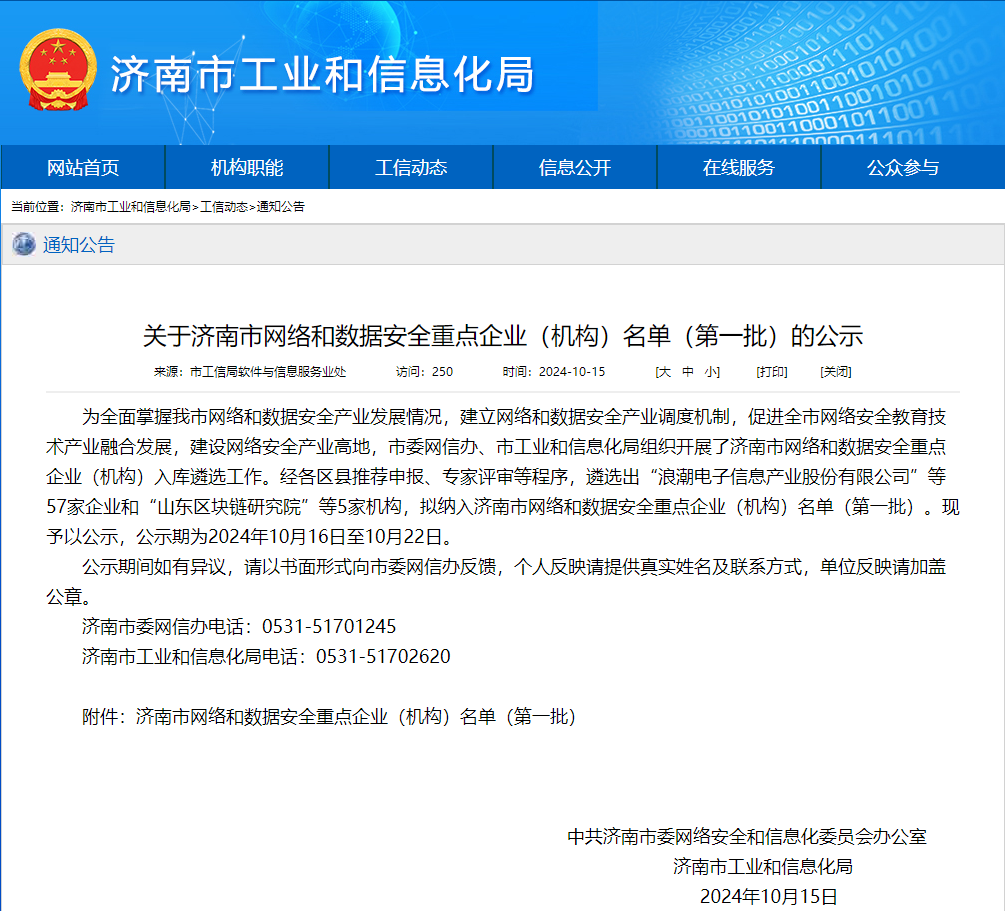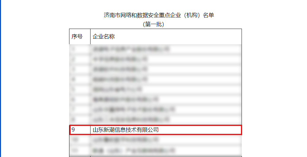 近日,市委網(wǎng)信辦、市工業(yè)和信息化局組織開展了濟(jì)南市網(wǎng)絡(luò)和數(shù)據(jù)安全重點(diǎn)企業(yè)(機(jī)構(gòu))入庫遴選工作。經(jīng)各區(qū)縣推薦申報(bào)、專家評審等程序,山東新潮信息技術(shù)有限公司(以下簡稱“新潮信息”)成功入選“濟(jì)南市網(wǎng)絡(luò)和數(shù)據(jù)安全重點(diǎn)企業(yè)名單(第一批)”。