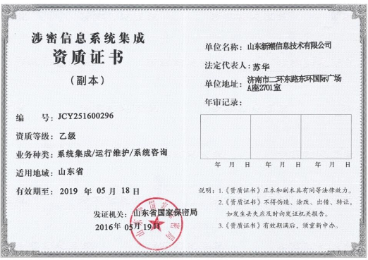 2016年5月,我公司獲得山東省保密局頒發(fā)的涉密信息信息系統(tǒng)集成資質(zhì),業(yè)務(wù)范圍包括:系統(tǒng)集成、運(yùn)行維護(hù)、系統(tǒng)咨詢,此證書成為我公司發(fā)展的又一里程碑。