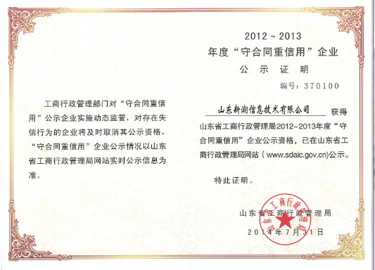 20147月,我公司獲得由山東省工商行政管理局頒發(fā)的守合同重信用企業(yè)證書。